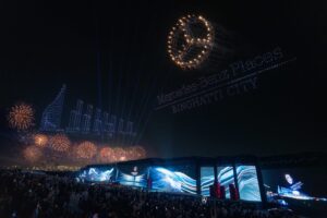 أما لحظة الكشف الثانية فاستعرضت المخطط العام للمجمع، وهو حي حضري جديد بالكامل يتكوّن من اثني عشر برجاً متناسقاً من الناحية المعمارية. وقد أضاء عرض واسع للطائرات المسيّرة أفق “ميدان”، تلاه إسقاط ليزري عبر ند الشبا يرسم محيط تشكيل الأبراج الاثني عشر، قبل أن تُتوَّج الليلة بعرض ألعاب نارية ضخم يرمز إلى حجم الرؤية وطموحها.