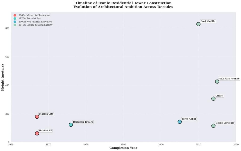 من خلال تتبع التطور الزمني للأبراج الأيقونية، لوحظ أن الستينات والسبعينات شهدت رواد الحداثة مثل Marina City في شيكاغو وHabitat 67 في مونتريال، بينما العقد الأخير (2010-2015) شهد ثورة حقيقية في الأبراج الفاخرة والمستدامة.