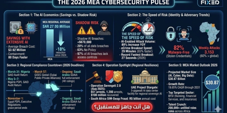 أصدرت شركة Fixed Solutions تقريرها التحليلي الجديد بعنوان «اتجاهات الأمن السيبراني 2026 في الشرق الأوسط وأفريقيا»، والذي يرصد أبرز التحولات في مشهد الأمن السيبراني بالمنطقة في ظل تسارع الاعتماد على التقنيات الرقمية وتزايد التهديدات السيبرانية المدعومة بالذكاء الاصطناعي. ويشير التقرير إلى أن عام 2026 يمثل نقطة تحول في طريقة إدارة المخاطر السيبرانية عالميًا، مع انتقال المؤسسات تدريجيًا من نموذج الدفاع التقليدي القائم على حدود الشبكات إلى نموذج أكثر تطورًا يعتمد على الأنظمة الذاتية والمرونة السيبرانية.